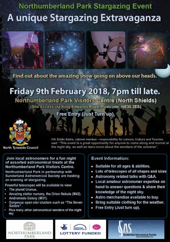 Back by popular demand, Sunderland Astronomical Society are will visiting Northumberland Park). Date: Friday 9th February 2018. Time: from 7:00 pm. Entry: Free (Contributions to SAS fundraising nonetheless welcomed). SAS have been asked by the Northumberland Park (the park in North Shields) to hold a Stargazing event on Friday 17th February from 7.00pm till late.